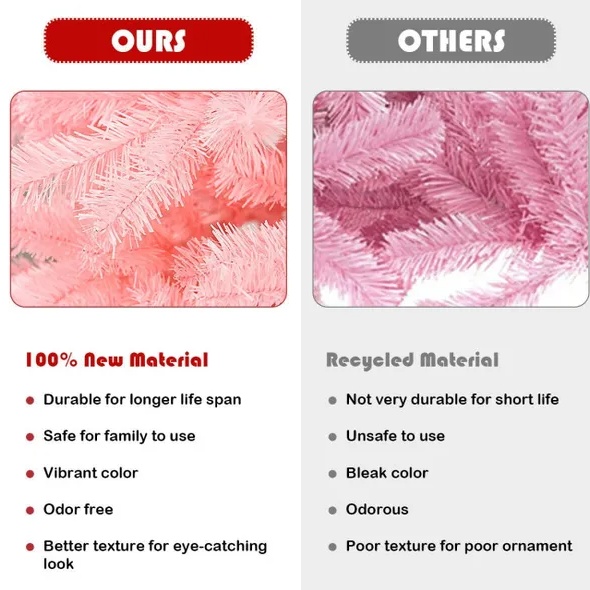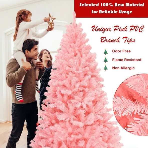 Bring this Christmas tree home to create you’re desired yet unique Christmas atmosphere.Unique cherry blossom pink color for an eye-catching decorationFull-bodied look with flourishing leaves for lush design3 Hinged sections for easy assembly, disassembly and storage100% New PVC material, no odor, non-flammable, non-allergic, superior to recycled oneExcellent durability, for enjoyment years after yearsA sturdy iron stand keeps the tree stand in an upright position all season longSuitable for home and commercial use, for wedding, birthday and Christmas party