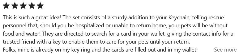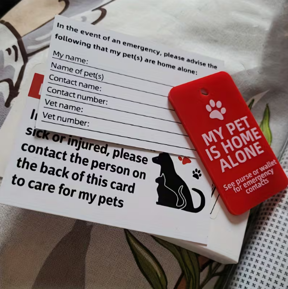 Pet Safety Card and Keychain Set for emergency contacts to care for your pet.  Ideal gift idea for folks with furbabies.  Non-electronic notification system for pet care in emergencies.  Durable key ring attachment, easy-to-read information card.  Essential for responsible pet guardians and peace of mind regarding the well being of your dogs and/or cats.