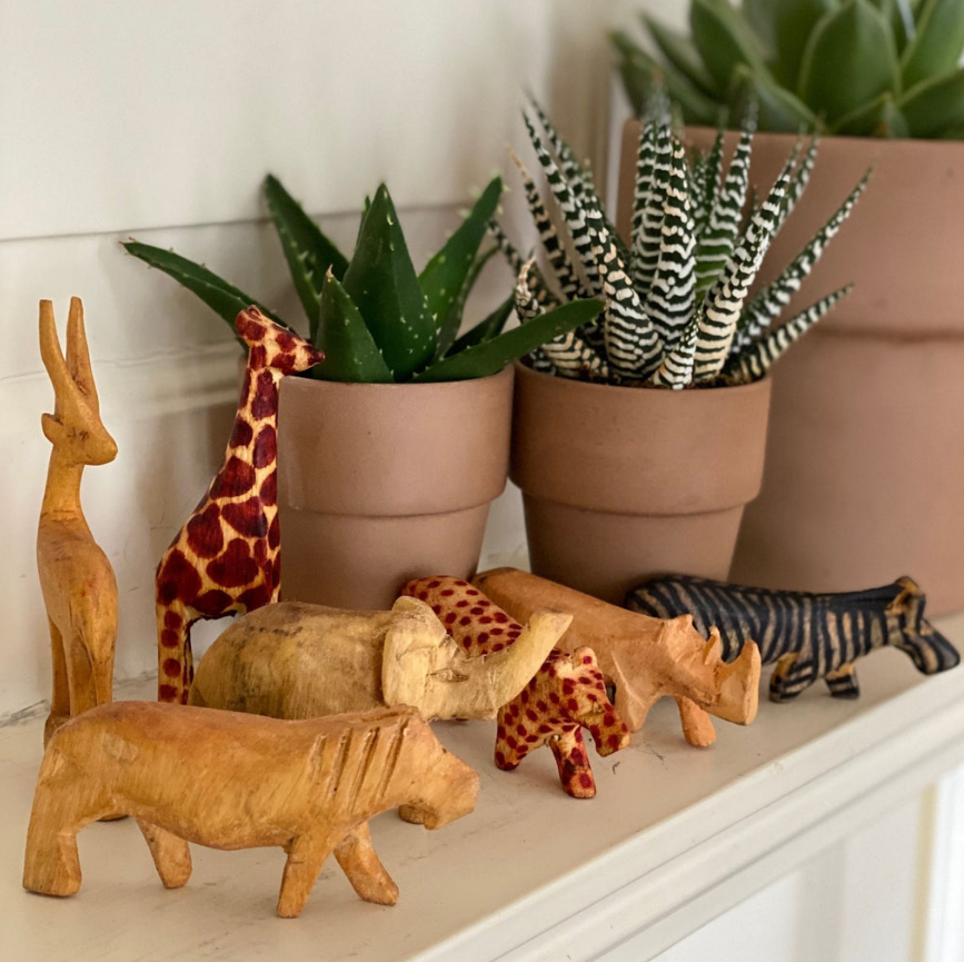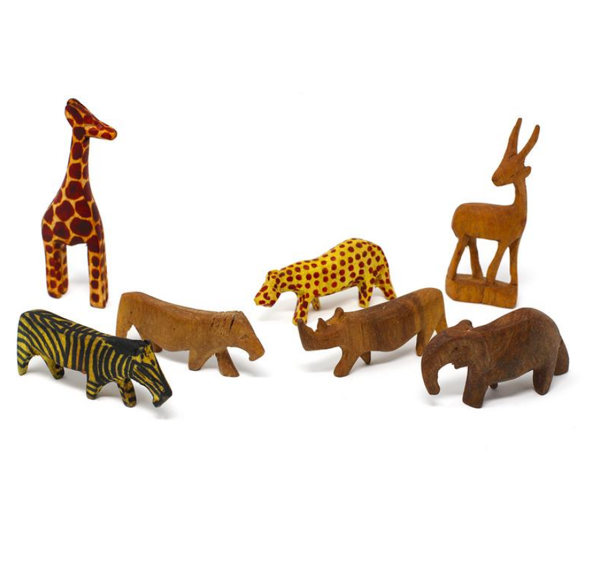 Seven different African animals carved from Muhugu wood. Each animal is 3-5 inches long. Sold as a set with a single tag.