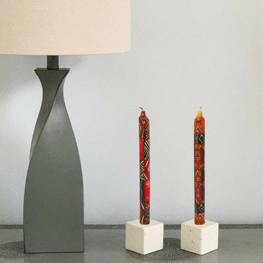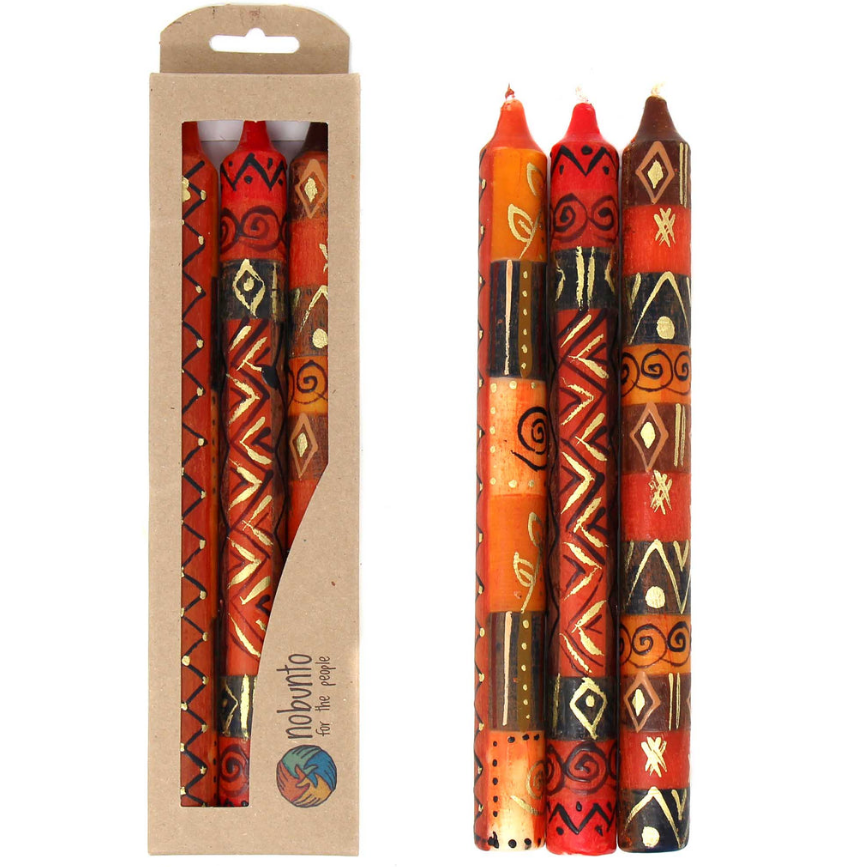 This set of three hand-painted candles comes in a gift box. Each candle is 9 inches tall by 0.75 inches in diameter.
